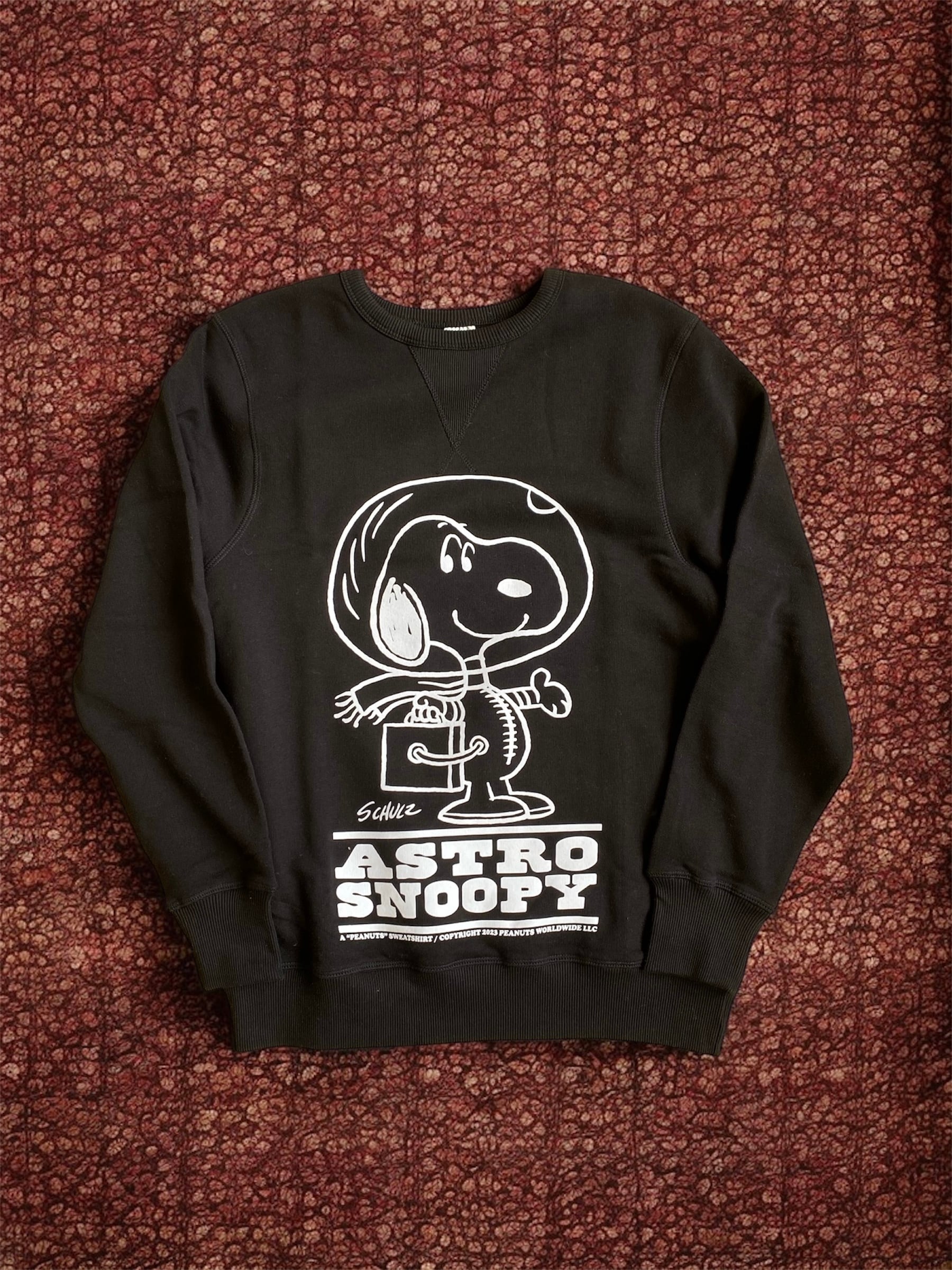 当時大人気だったピーナッツの書籍シリーズから発展し、太く大胆なフォントやサイケデリックなカラーリングをそのまま活かしたデザインは、それまでのスウェットの常識を覆す革新的なものでした。