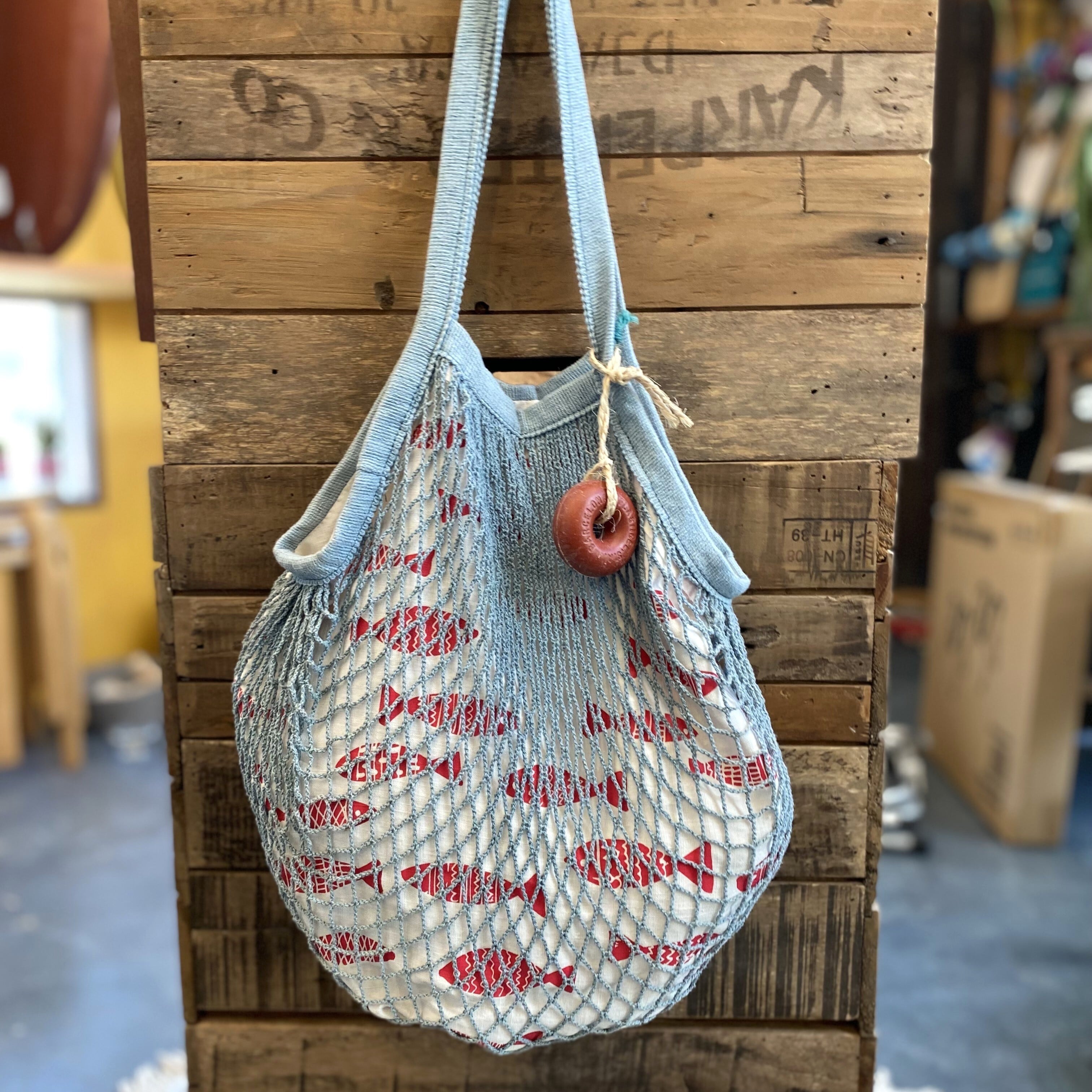 地中海の漁港や漁村を美しくいイメージしてデザインされたバッグ。網の向こうに可愛いお魚たち、ブイのアクセント。全てが可愛い1点ものです。日本ではほぼ入手不可かと思います。